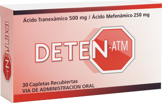 DETEN ATM combina la acción del Ácido Tranexámico (500 mg) y el Ácido Mefenámico (250 mg) en una fórmula especialmente desarrollada para aliviar el dolor menstrual y reducir el sangrado excesivo.